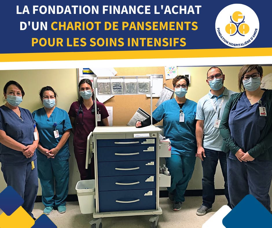 La Fondation Hospitalière d’Amos s’implique dans les soins intensifs à l’hôpital d’Amos. La Fondation est fière d’avoir investi une somme de 3 800 $ pour financer un nouveau chariot de pansements à l’unité des soins intensifs.